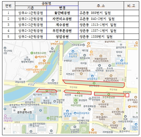 또 쌍촌동 상무2-2근린공원, 상무2-3근린공원, 상무2-4근린공원은 계수공원, 무진푸른공원, 상암공원으로 새 이름을 붙였다. ‘계수공원’은 인근 계수마을에서 이름을 따왔으며, 무진대로에 위치한 ‘무진푸른공원’은 전나무와 소나무 등 상록수가 우거져 사시사철 푸르름을 만끽할 수 있다. 또한 ‘상암공원’은 마을의 옛명칭인 ‘상암’을 공원 이름에 붙였다.