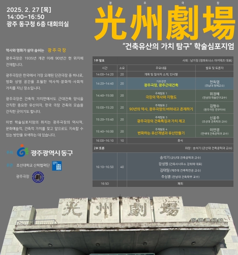 1부에서는 천득염 전남대학교 명예교수의 기조 강연인 ‘광주극장, 광주 근대 건축’을 시작으로 ‘극장의 역사와 지형도’(위경혜 전남대 연구교수), ‘90년의 역사, 광주극장의 버텨내고 존재하기’(김형수 광주극장 전무이사), ‘광주극장의 건축 특징과 가치 제고’(신웅주 조선대학교 교수), ‘변화하는 유산 개념과 유산 만들기’(이연경 연세대학교 교수) 등의 주제 발표가 이어진다.