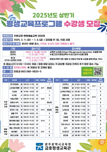 수강 신청은 금호평생교육관 누리집에서 회원가입한 후 온라인 접수하거나, 운영과에 방문해 접수하면 된다. 접수 기간은 ’평생교육프로그램‘은 온라인 2월 18~21일, 방문 3월 5~8일까지이며, ’성인문해교실‘은 온라인 2월 25~28일, 방문 3월 12~15일까지이다.