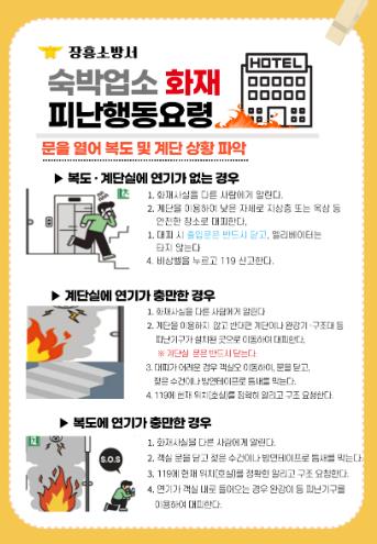 장흥소방서는 “숙박시설 화재는 대형 인명피해로 이어질 수 있으니 숙박업소를 운영하는 관계인, 군민은 소중한 생명을 보호할 수 있도록 화재피난 행동요령을 숙지하여야한다.”며 “지속적으로 피난 행동요령을 홍보하겠다”고 말했다.