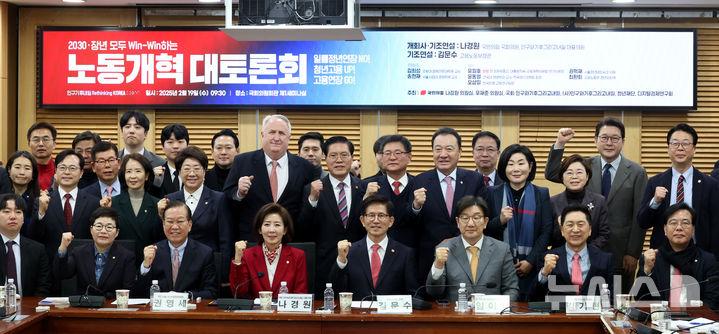 나경원·우재준 국민의힘 의원과 국회인구와기후그리고내일, 청년재단, 디지털경제연구회는 19일 오전 서울 여의도 국회에서 '2030·장년 모두 Win-win하는 노동개혁 대토론회'를 열었다.