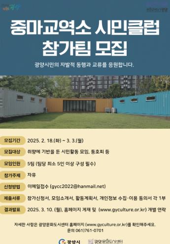 박시훈 광양문화도시센터장은 “광양에는 소규모 문화예술 모임을 원하는 시민들이 많다. 이들의 활동을 응원하고 교류 기회를 제공하는 것은 문화도시의 기반을 다지는 중요한 과정이라 생각한다”며 “광양문화도시센터 사업 중 시민들의 호응과 만족도가 가장 높은 프로그램 중 하나인 ‘중마교역소 시민클럽’에 많은 관심과 참여를 부탁드린다”고 말했다.