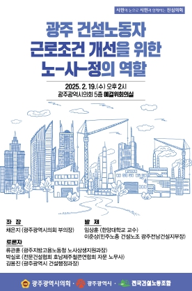 광주시의회 채은지 의원은 19일 오후 2시 광주시의회 예산결산특별위원회 회의실에서 ‘광주 건설노동자 근로조건 개선을 위한 노-사-정의 역할’을 주제로 정책토론회를 개최했다.