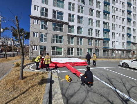 훈련에는 입주민들과 아파트 관계자들이 참여했으며, 실제 상황을 가정하여 공기안전매트를 활용한 대피 훈련을 통해 위기 상황에서의 대처 능력을 향상시켰다. 공기안전매트는 화재 발생 시, 연기가 가득한 환경에서 안전하게 대피할 수 있도록 도와주는 중요한 장비로, 입주민들의 안전을 지키는 데 큰 역할을 한다.