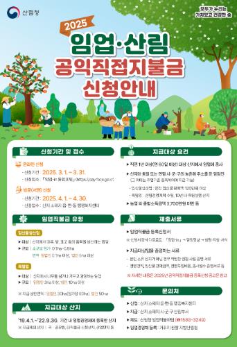 특히, 올해는 임업인의 신청 편의를 위해 임업직불금 신청 기간을 1개월 앞당기고 신청 기간을 1개월 연장해 운영한다.