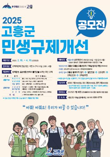 이번 공모전은 온라인 접수 창구(고흥군 대표 누리집→열린민원→신고센터→규제신문고→규제공모전)를 마련해 접근성을 높였으며, 지역의 핵심과제뿐만 아니라 민생을 저해하는 불합리한 규제를 집중적으로 발굴하고 개선하기 위해 기획됐다.
