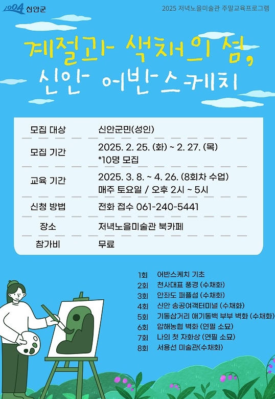 어반스케치는 일상이나 여행지에서 직접 눈으로 보고 느끼며 그리는 회화 활동이다. 이번 프로그램은 신안의 아름다운 자연과 지역 명소를 작품으로 표현한다. 전문 강사와 초보자도 쉽게 따라 할 수 있는 기초적인 스케치 기법, 색채 활용법, 풍경 묘사 기법 등을 단계적으로 배우며 수채화와 연필 소묘를 활용해 천사대교, 퍼플섬, 기동삼거리 애기동백 부부 벽화 등 신안군의 명소를 화폭에 담아낼 예정이다.