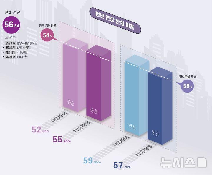 다만 공공 부문은 기성 세대가 정년 연장에 찬성하는 비율이 55.5%로, MZ 세대(52.6%)보다 2.9%p 높았다.