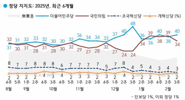 한국갤럽이 지난 18~20일(2월 셋째 주) 전국 만 18세 이상 유권자 1002명을 대상으로 정당 지지도를 조사해 이날 발표한 결과에 따르면 국민의힘은 34%, 민주당은 40%로 집계됐다.