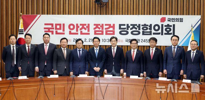 권성동 국민의힘 원내대표는 이날 오전 국회에서 열린 '국민안전 점검 당정협의회'에서 "요즘 연이어 들린 사고 소식에 마음이 무겁다. 제주항공 여객기 참사의 비극이 채 가시기 전에 2월 한달간 벌써 세 척 어선이 침몰하거나 전복됐다. 최근 부산 기장군에서 건설현장의 큰 화재도 있었다"며 "다시 한번 고인 명복과 부상자의 빠른 회복을 기원한다. 이런 일이 다시 발생 않도록 꼼꼼히 점검해야겠다"고 밝혔다.