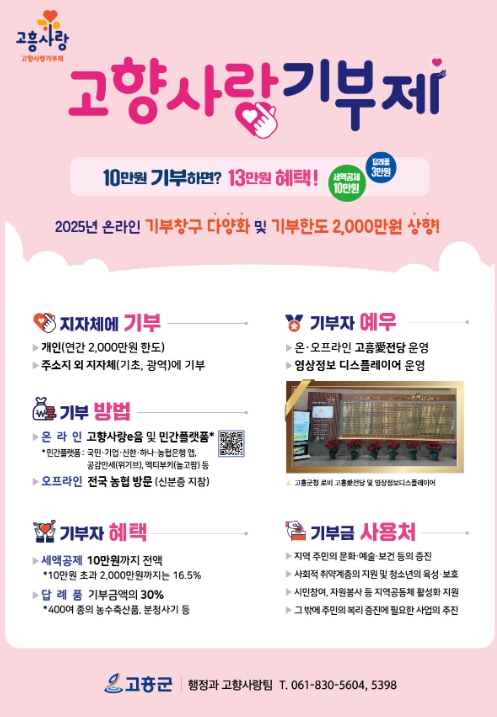 고흥군은 이번 프로젝트를 통해 기부 참여를 높이고, 이를 지역발전과 연계해, 2025년에는 고향사랑기부제 활성화를 통해 전국 최고의 모범 지자체로 자리매김할 계획이다.