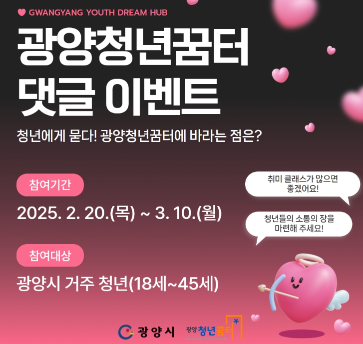 오영숙 광양청년꿈터 센터장은 “청년들의 의견이 직접 반영된 프로그램을 만들기 위해 이번 이벤트를 기획했다”며 “앞으로도 청년들과 지속적으로 소통하며 함께 성장할 수 있는 공간으로 자리매김하겠다”고 말했다.