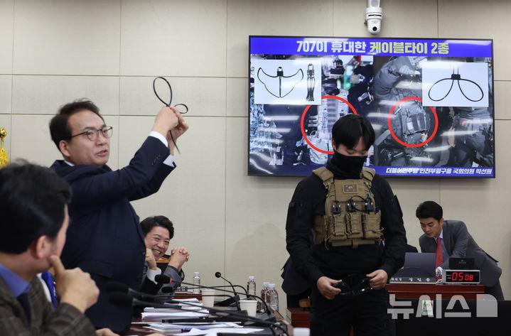 더불어민주당 의원이 '포박용'이라며 손목을 묶는 시범을 보이자, 국민의힘 의원들이 단체로 항의하며 한때 소란이 빚어지기도 했다.