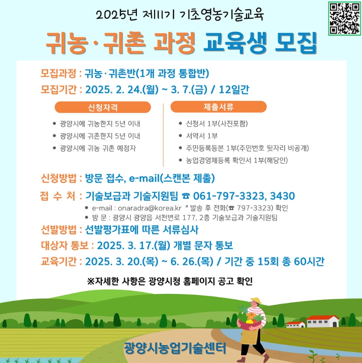 모집 인원은 30명이며, 모집 대상은 광양시 전입 5년 이내의 귀농인(귀촌인)이거나 농업경영체등록을 마친 5년 이내의 신규농업인이다.