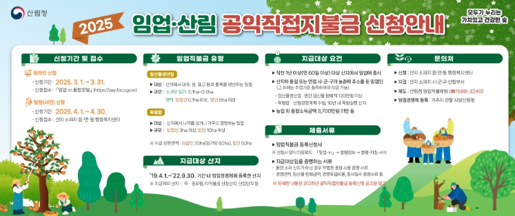 특히, 올해는 임업인의 신청 편의를 위해 임업직불금 신청 기간을 1개월 앞당기고, 동시에 1개월 연장해 운영한다.