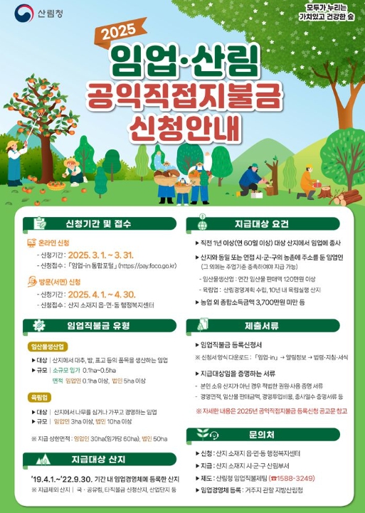 그 외 자세한 사항은 구례군 산림과와 읍면사무소, 또는 산림청 임업직불금 상담센터( 연중 운영)에 문의하면 된다.