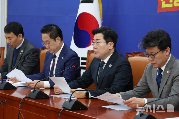 박찬대 원내대표는 이날 원내대책회의에서 "민주당은 야5당과 함께 명태균 특검법을 처리하겠다"며 "특검으로 윤석열·김건희 부부와 명태균의 공천 개입, 여론조사 조작, 중대 범죄의 전모를 낱낱이 밝혀내야 무너진 헌정 질서를 바로 세울 수 있다"고 밝혔다.