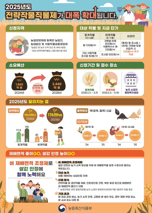 동계작물은 작년 가을 파종하여 ~ 봄에 수확하는 보리, 밀, 조사료 등이며 하계작물은 올해 봄에 파종하여 부터 가을에 수확하는 두류, 가루쌀, 하계 조사료 등이 대상으로, 품목에 따라 ha당 최대 500만원의 직불금을 지원한다.