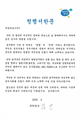 한편, 무안군은 2025년을 ‘청렴무안’ 구현의 원년으로 삼아 강력한 반부패 정책과 조직문화 혁신으로, 군민들이 체감하고 신뢰할 수 있는 청렴 문화를 조성해 나갈 계획이다.