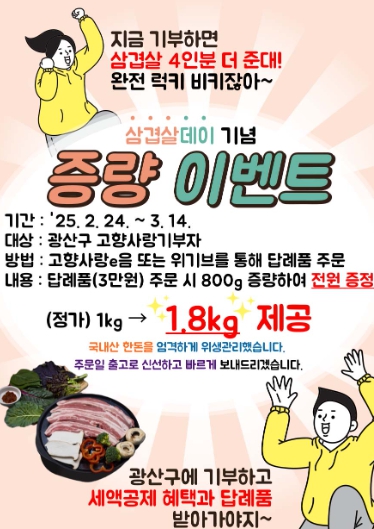 광산구는 이벤트 동안 광산구 고향사랑기부자를 대상으로 삼겹살을 선택할 경우, 기존 1㎏에서 800g 증량한 1.8㎏을 제공한다.
