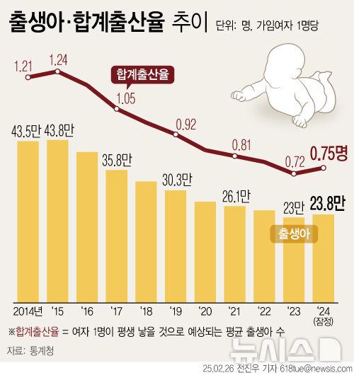 여성 1명이 평생 낳을 것으로 예상되는 평균 출생아 수를 나타내는 합계 출산율은 0.75명으로 전년(0.72명)보다 0.03명 증가했다. 합계출산율 역시 9년 만에 증가 전환이다.