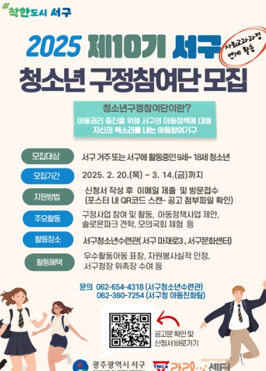 올해 모집 대상은 광주 서구에 거주하거나 활동하는 9세 이상 18세 미만 아동이며 3월 14일까지 서구청 양성아동복지과에 방문하거나 전자우편으로 관련 서류를 제출하면 된다.