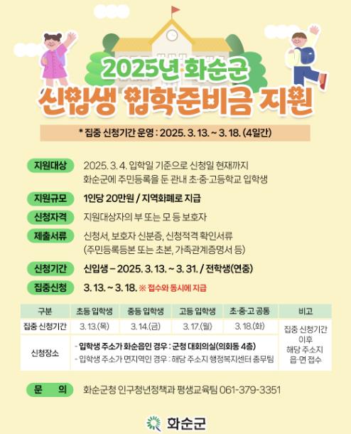 입학준비금 지원 대상은 2025년 3월 4일 기준으로 화순군에 주민등록을 두고 관내 초·중·고등학교에 입학하거나 전입하는 1학년 학생이다.