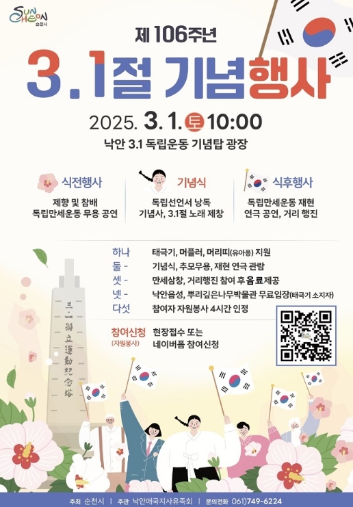 이번 행사는 순국선열의 숭고한 나라 사랑 정신을 계승하고 3.1절 의미를 기념하는 자리로 순천시장을 비롯한 기관·단체장, 유족 등 500여 명이 참석할 예정이다.