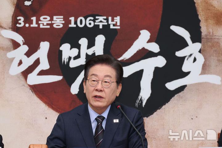 이재명 대표는 이날 국회 본청에서 열린 확대간부회의에서 "3·1절을 맞으면서 대한민국 집권 세력이 헌법 질서 파괴 행위에 동조하면서 스스로를 보수라고 부르는 것이 참으로 황당한 느낌"이라고 말했다.