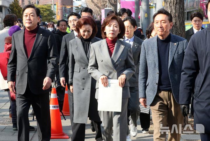 나경원 의원을 비롯한 국민의힘 의원들은 이날 오전 국회에서 기자회견을 열고 "우리는 오직 법치주의와 헌법정신에 충실한 결정만이 극단적인 국론 분열을 막고 국가적 위기를 극복할 수 있다는 점을 깊이 인식한다"며 "이에 헌재가 정파적 이해관계나 정치적 고려를 배제하고 오직 헌법과 법률에 근거한 공정하고 신중한 판단을 해줄 것을 간절히 촉구한다"고 밝혔다.