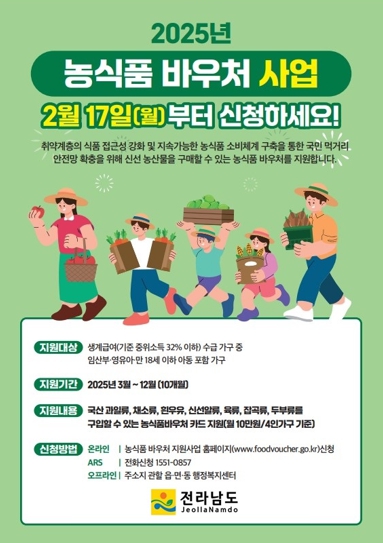 농식품바우처 지원사업은 기준 중위소득 32% 이하 생계급여 수급 가구 중 임산부·영유아·만 18세 이하 아동을 포함한 가구에 신선한 농식품을 구매할 수 있는 바우처(카드)를 지급하는 제도다.