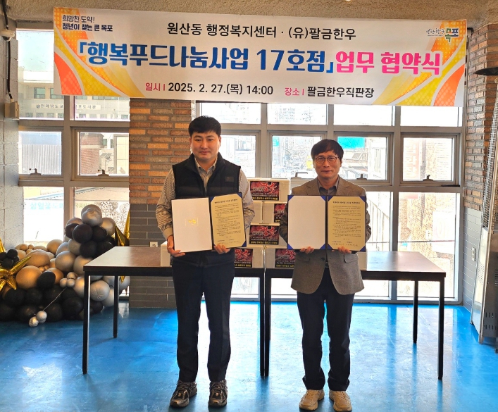 황성용 원산동장은 “지역 주민을 위해 나눔가게 협약에 동참해 주신 이영주 대표께 감사의 인사를 드리며, 앞으로도 지속적인 행복푸드나눔가게 발굴을 통해 행복한 원산동을 만들어 나가도록 노력하겠다”고 밝혔다.