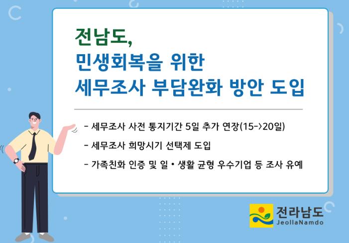박성열 전남도 세정과장은 “세무조사는 공정한 조세 행정을 위해 반드시 필요하지만, 기업 활동을 위축시키지 않도록 신중하게 운영할 것”이라며 “앞으로도 세무조사와 관련한 다양한 지원책을 마련해 기업의 조사 부담을 완화하고, 보다 신뢰할 수 있는 합리적 세무조사 방안을 지속해서 마련하겠다”고 말했다.