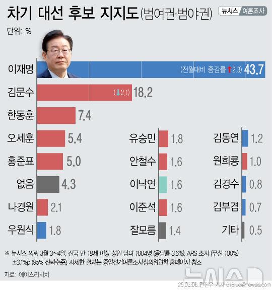 에이스리서치가 뉴시스 의뢰로 지난 3~4일 전국 만 18세 이상 남녀 1004명을 대상으로 실시한 차기 대통령 후보 적합도 조사 결과 이 대표가 43.7%, 김 장관이 18.2%로 집계됐다.