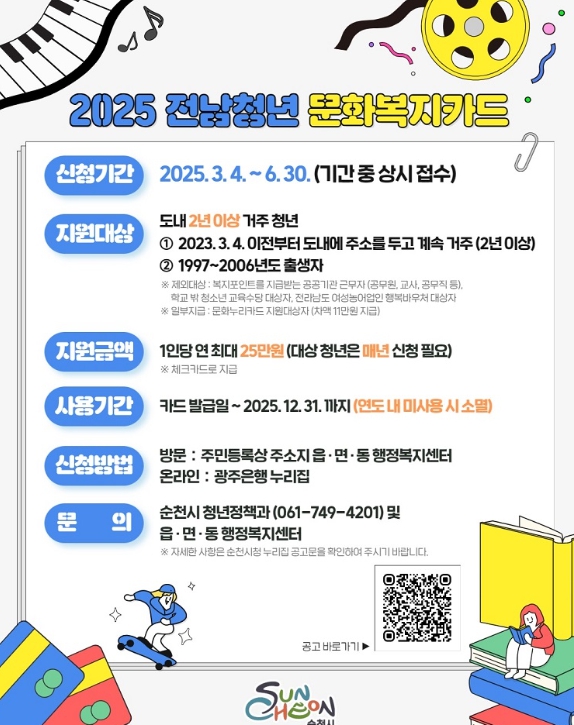 시 관계자는 “전남청년 문화복지 카드 지원사업이 일상에 지친 청년들에게 조금이나마 도움이 되길 바란다”며, “다양한 정책이 일상에서 체감될 수 있도록 아낌없는 노력과 지원을 다하겠다”고 말했다.