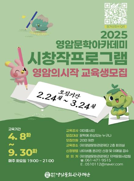 (재)영암문화관광재단 지역문화사업팀 조소영 PD는 “이번 프로그램을 통해 영암의 문학적 토양이 더욱 풍성해지고, 문학 창작의 중심지로 자리 잡는 계기가 되기를 희망한다.”고 전했다.
