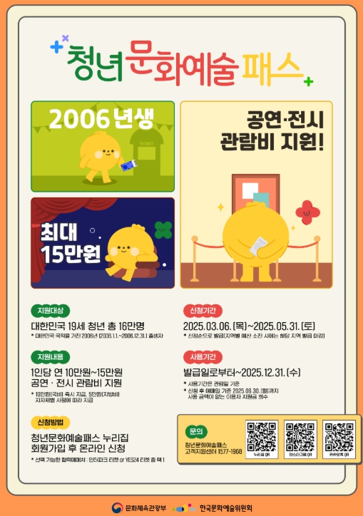 ‘청년문화 예술패스’는 문화체육관광부와 함께하는 사업으로 2006년생 청년들에게 연극·뮤지컬·클래식 등 공연과 전시 관람을 통해 문화 향유 기회를 제공해 품격 있는 시민이자 문화 소비 주체로 성장할 수 있도록 돕는다.