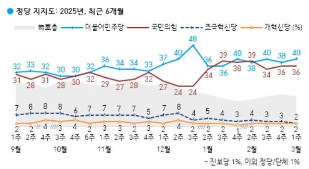 이어 조국혁신당과 개혁신당은 2%, 이외 정당·단체는 각각 1%의 지지율을 기록했다. 지지하는 정당이 없는 무당층은 18%다.