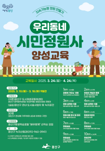 박병규 광산구청장은 “시민정원사 양성은 시민의 참여로 도심 녹지공간에 생기를 불어넣고, 오래도록 푸르고 건강하게 가꾸는 출발점이 될 것”이라며 “생활 속 녹지공간을 확대하고, 스스로 가꾸는 공동체 문화가 활성화되도록 힘껏 뒷받침하겠다”고 밝혔다.
