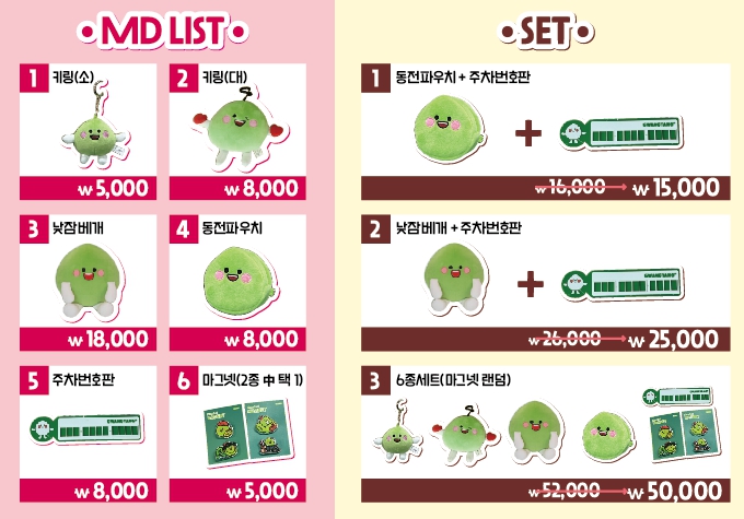 굿즈 가격은 마그넷 5천 원, 동전 파우치와 주차번호판은 각각 8천 원, 키링은 규격에 따라 5천원, 8천원, 낮잠 베개 1만 8천 원 등이다.