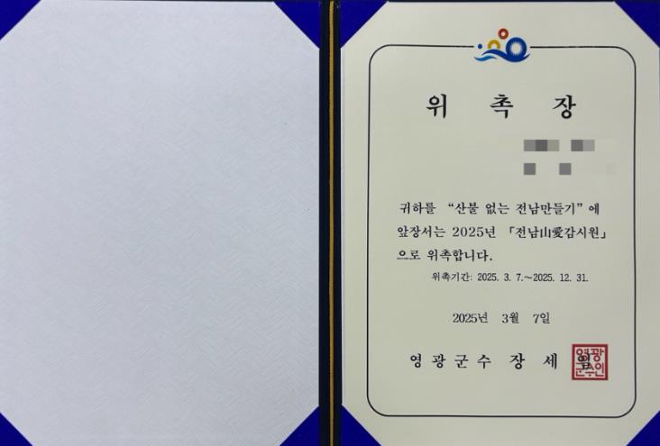 전남 山愛 감시원은 집배원, 택시 기사, 생활지원사, 자율방범대 등 총 36명으로 위촉일인 3월 7일부터 12월 31일까지 활동한다.