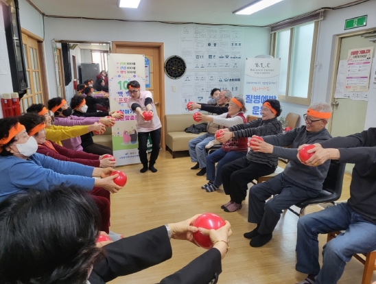 백·백·백 프로젝트는 어르신들 몸의 근육과 관절 기능을 향상할 수 있도록 짐볼, 요가 매트 등 소도구를 활용한 질병 예방 운동을 진행한다.