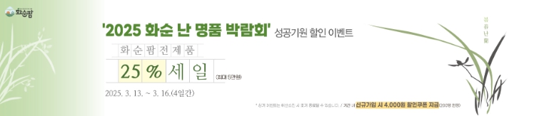 25% 할인 쿠폰은 전 품목에 최대 5만 원 한정으로 화순팜의 회원에만 적용되며, 본 이벤트 기간에 가입한 신규회원 중 선착순 200명에게는 4,000원 할인 쿠폰이 지급된다.