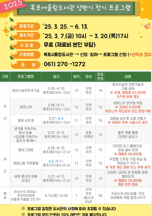 시 관계자는 “목포어울림도서관이 준비한 상반기 정기 프로그램을 통해 지역주민의 적극적인 평생학습 활동에 기여하길 바란다”고 말했다.