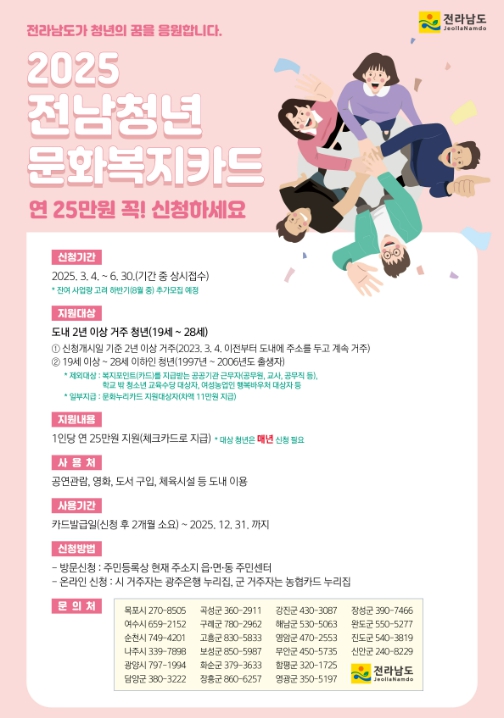 지원 대상은 2023년 3월 4일 이전부터 전라남도에 주소를 두고 계속 거주하고 있는 19세 이상 28세 이하(1997 부터 2006년 출생) 청년이며 1인당 연 25만원의 문화복지비를 지원한다.