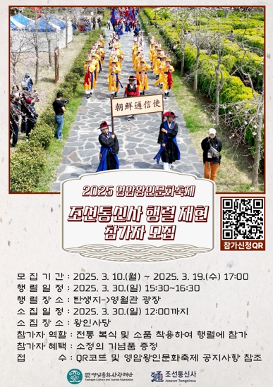 끝으로 2025 영암왕인문화축제는 3월 29일부터 4월 9일까지 영암군 일대에서 진행되며, 조선통신사 행렬은 30일(일요일) 선보일 예정이다.