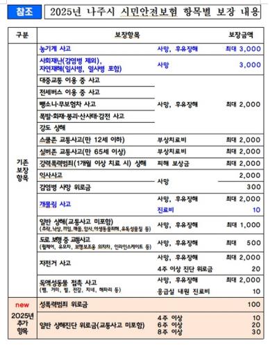 보장 항목 및 보험금 신청 방법 등은 NH농협손해보험 시민안전보험 전용 콜센터, 나주시 안전재난과, 나주시 홈페이지 등을 통해 상세 내용을 확인할 수 있다.