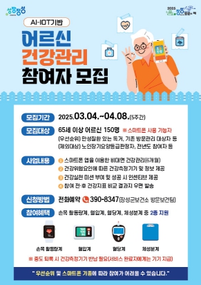 만성질환이 있는 홀몸 어르신과 기존 방문건강관리 대상주민 등을 우선 선발할 예정이다. 노인장기요양등급 판정자, 모바일헬스케어 대상자, 지난해 참여자 등은 신청할 수 없다.