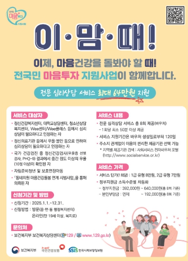 지원 대상은 ▲정신건강복지센터, 대학교 상담센터, 청소년상담복지센터, Wee센터 및 Wee 클래스, 정신의료기관 등에서 심리상담이 필요하다고 인정받은 시민 ▲자립준비청년 및 보호연장아동 ▲국가건강검진에서 중간 정도 이상의 우울이 확인된 시민이다.