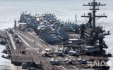 순천 손태성 기자2025. 11.05[나이스데이] 미국의 핵추진 항공모함 조지워싱턴함(CVN)이 5일 부산작전기지에 입항했다. 해군에 따르면 조지 워싱턴함(CVN) 등 제5항모강습단은 이날 군수적재 및 승조원 휴식을 위해 부산을 찾았다. 입항 함정은 조지워싱턴함을 비롯해 순양함 로버트 스몰스, 이지스구축함인 밀리우스와 슈프 등 총 4척이다. 니미츠급(10만t급)인 이 핵항모는 길이 333m, 폭 76.8m, 비행갑판 면적은 축구장 3배 규모이며, 승조원은 6000여 명이다. 특히 최신예 스텔스 전투기 F-35C와 슈퍼호넷 전투기(F/A-18), 호크아이 조…